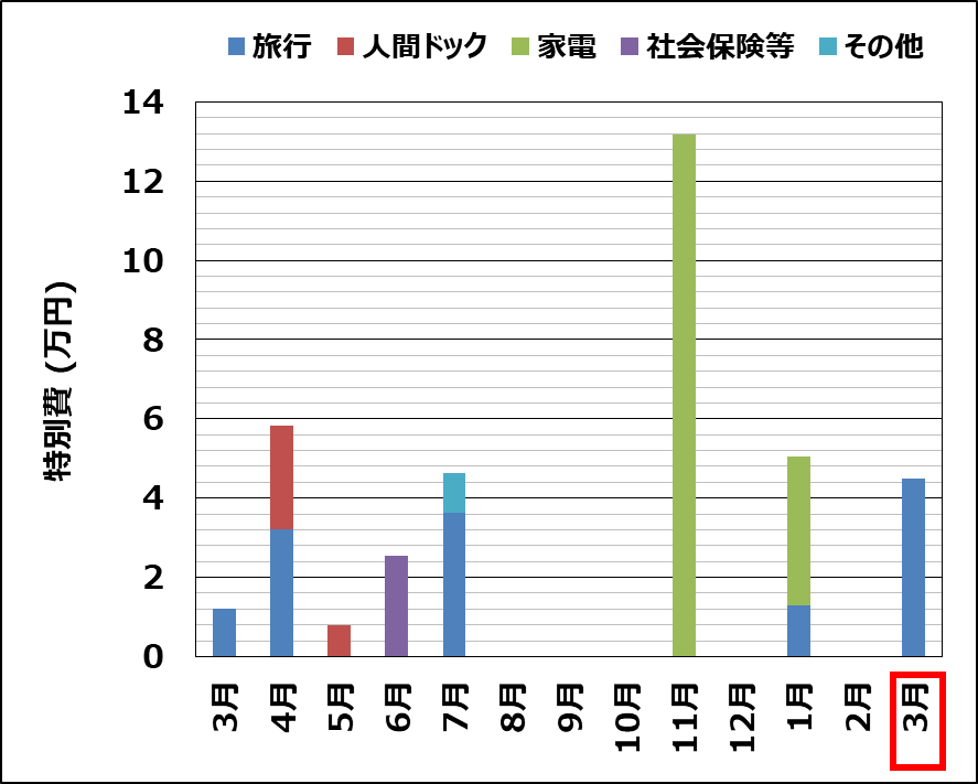 - 特別費:旅行代や人間ドック代等の不定期で高額な出費